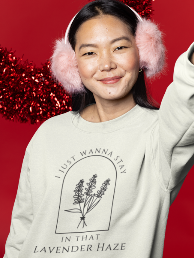Stay cozy, calm, and a little bit enchanted with our Lavender Haze crewneck sweater. Inspired by dreamy, romantic vibes, this design features minimalist line-art lavender bundled inside an arched frame, paired with the lyric “I just wanna stay in that lavender haze.” Subtle, elegant, and effortlessly stylish—this piece is perfect for Swifties and anyone who loves a gentle, modern aesthetic.