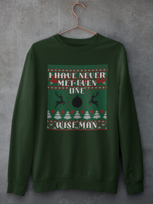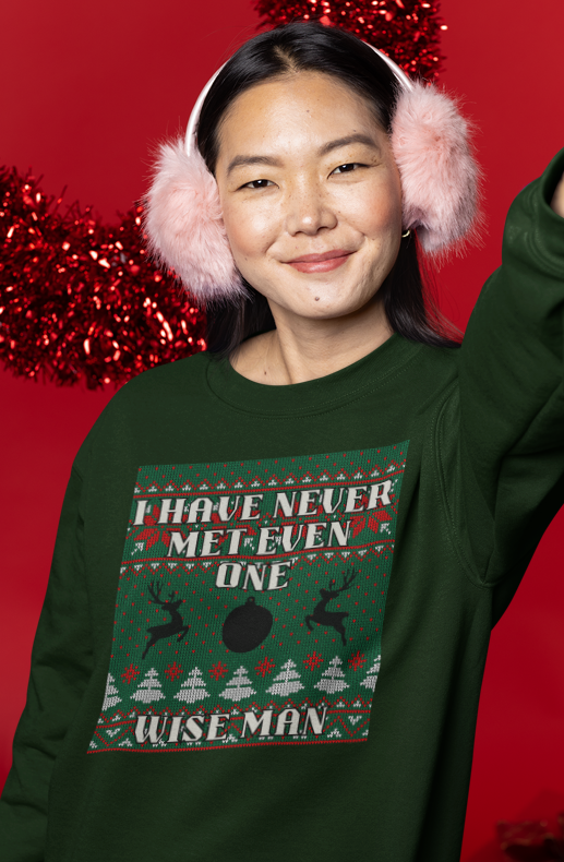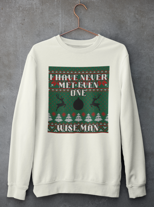 For the ones who like their holiday humor with a bit of attitude, the Never Met a Wise Man crewneck is the ultimate conversation starter. Designed with a playful “ugly Christmas sweater” pattern and festive reindeer accents, this sweater delivers classic seasonal vibes with a witty twist that’s sure to make everyone laugh.