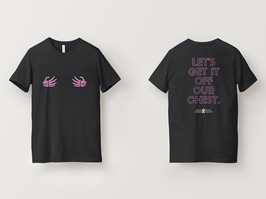 The front features two pink skeletal hands placed playfully across the chest, symbolizing both strength and vulnerability. The back delivers a powerful message in vibrant pink lettering: “Let’s Get It Off Our Chest.” It’s equal parts cheeky and empowering — a perfect reminder that talking about breast health can save lives.