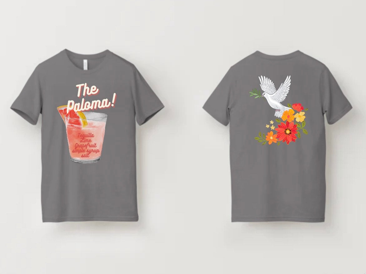 Fresh, bright, and full of character—our Paloma Tee is a toast to one of Mexico’s most refreshing cocktails. A watercolor-style illustration of the Paloma cocktail featuring its classic recipe—tequila, lime, grapefruit, simple syrup, and a touch of salt—captured in playful retro lettering. A graceful white dove carrying an olive branch, surrounded by colourful flowers, symbolizing peace and the meaning behind the word “Paloma.”