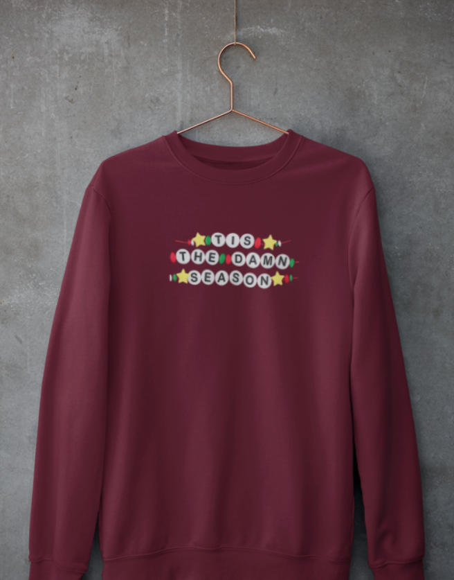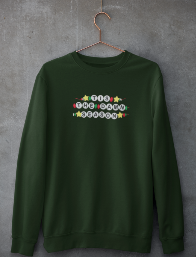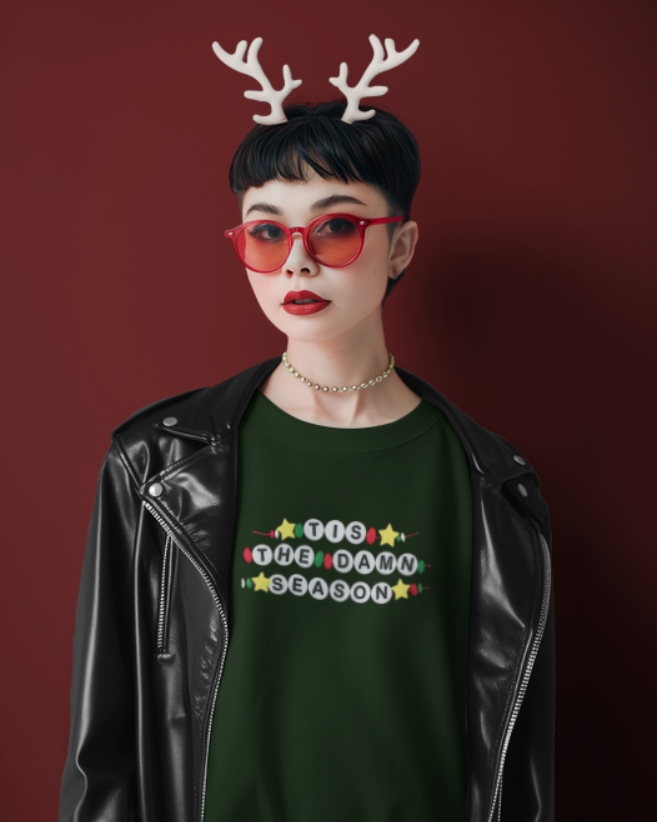 Bold, cozy, and a little bit cheeky—our ’Tis the Damn Season crewneck is the ultimate statement piece for anyone who embraces the chaos and the charm of the holidays. Featuring playful lettered “beads” strung like festive lights, this design pops beautifully against the deep forest-green fabric for a look that’s equal parts cute and confident.